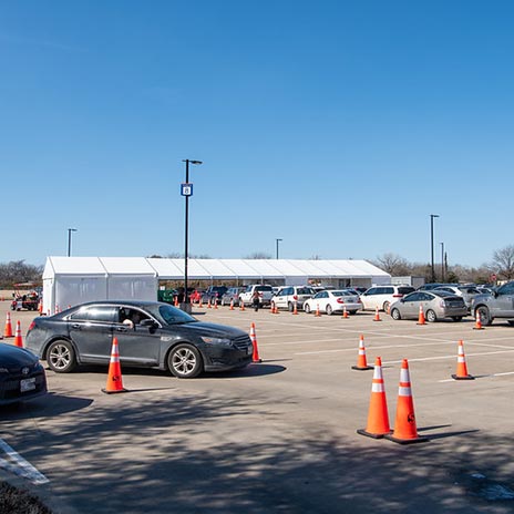 Cars line up for a drive-thru vaccination clinic at Dallas College Eastfield Campus.