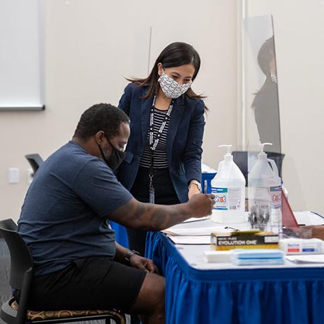 Volunteer Diana Arredondo assists a community member with COVID vaccination registration at Dallas College Mountain View Campus.
