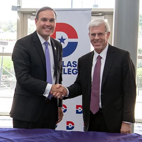 Tarleton President James Hurley (left) and Dallas College Chancellor Joe May celebrate the new transfer agreement between the institutions that broadens options for students.