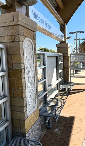 “Every aspect of the station that I selected was inspired by the place and history of the station site,” she said. She matched the soft, golden tan of native grass for the station color. The pavement under the columns has three brick colors in two curved lines for the rolling hills of Las Colinas.