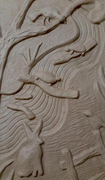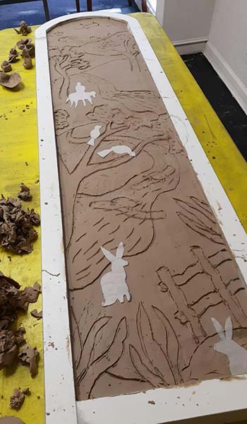 She created outline drawings and had them printed to size. She then traced the drawings onto the clay and began to carve up and down to create casts. When completed, the two panels were cast in a white stone Ray had selected.