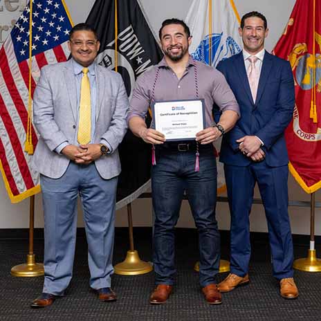 Michael Rojas (center), a former Marine, was one of 50 outstanding scholar-veterans recognized May 6. He is pictured with Councilman Jaime Resendez (left), guest speaker at the event, and Jon Tarell (right), Dallas College Military-Connected Services.