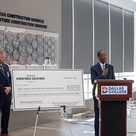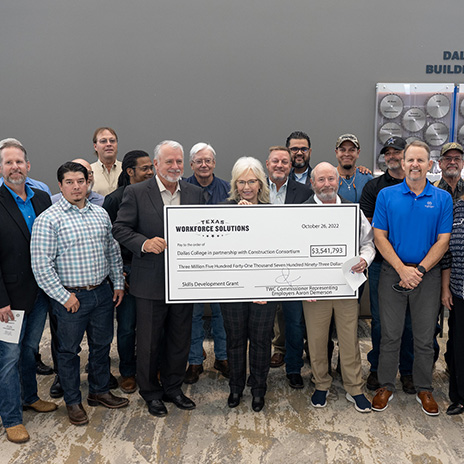 (DALLAS) — Dallas College has been awarded a $3.5 million Skills Development Fund grant from the Texas Workforce Commission (TWC) to train more than 1,500 employees in construction-related courses. The grant, announced at a special check-signing ceremony today with TWC Commissioner Aaron Demerson, is aimed at expanding trainees' current job responsibilities and increasing productivity for Texas employers.