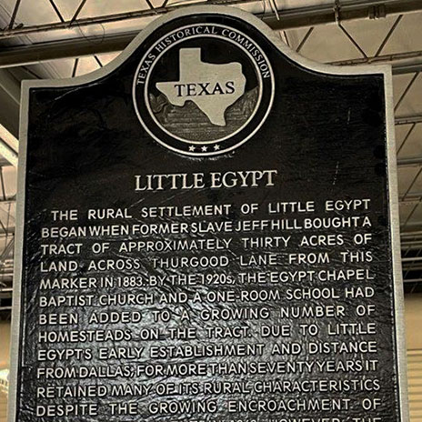 The Texas Historical Commission has designated the site as an educational part of local history. A ceremony to unveil a historical marker takes place at noon Saturday, May 20, 2023, at 8630 Thurgood Lane in Dallas. Speakers include Dallas City Councilmember Adam McGough, former Dallas College professors Dr. Clive Siegle and Dr. Tim Sullivan, as well as descendants of the original settlers of Little Egypt.