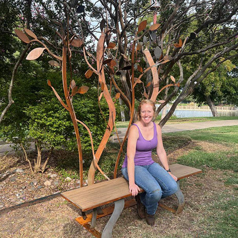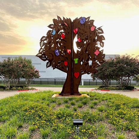 She spent a year fabricating outdoor furniture for Raising Cane’s restaurants. “If you sit on fabricated furniture at Raising Cane’s, I probably made it,” she said. She was commissioned by her hometown of Richardson to construct a tree in the parking lot of the Network of Community Ministries.